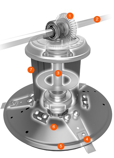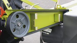 Der verwindungssteife Getrieberahmen ist über einen extrastarken Flansch mit den Trommeln verschraubt und leicht zugänglich. Der geradlinige Eintrieb erlaubt eine verlustfreie Kraftübertragung auf die Keilriemen.