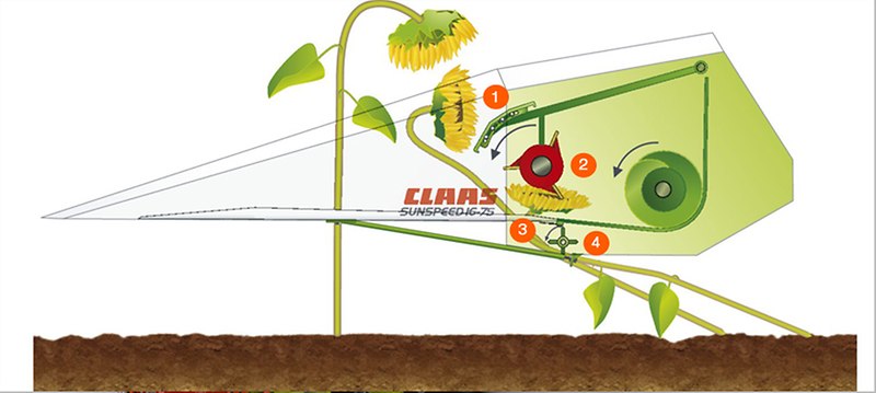 Zunächst werden die Sonnenblumen von den Schiffchen erfasst. Das verstellbare Einweisblech sorgt dann dafür, dass die Sonnenblumenkörbe nach vorn gedrückt werden. Gleichzeitig drückt die Reißwalze unterhalb des Messerbalkens die Stängel nach unten. Das Einweisblech und die Reißwalze verhindern somit, dass die Stängel vorzeitig geschnitten werden. Erst wenn die Sonnenblumenköpfe von der Haspel erfasst werden, erfolgt der Schnitt. Dadurch gelangen nur die Sonnenblumenkörbe zur Einzugsschnecke, von wo aus sie letztlich zum Einzugskanal gelangen.